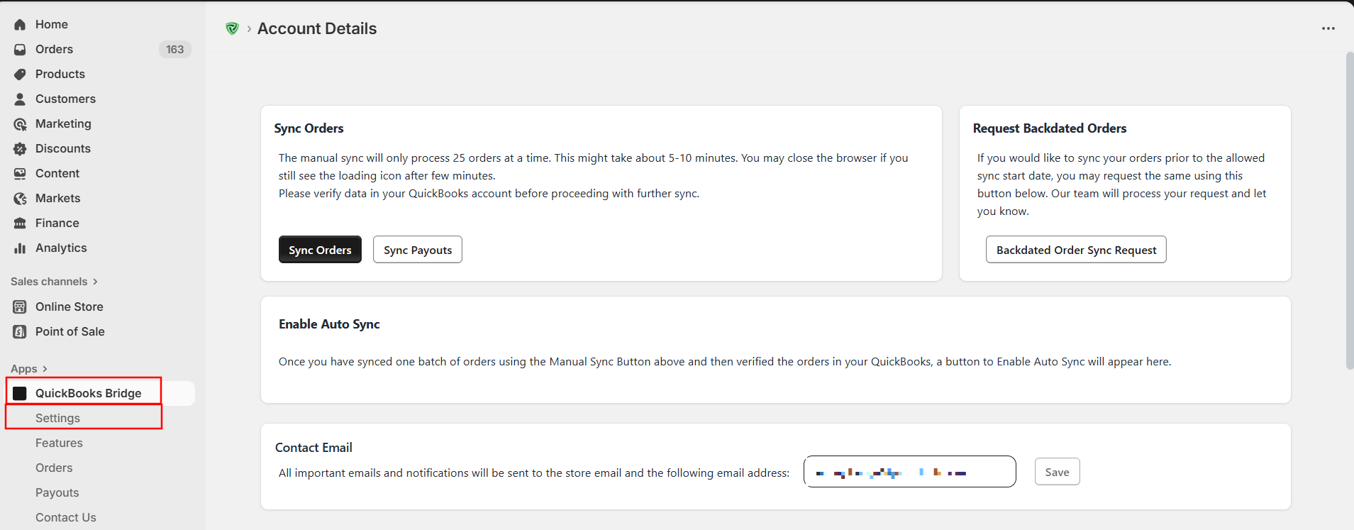 This will land on the settings page of our app where you can complete the app settings and data will sync to the newly connected QuickBooks company.