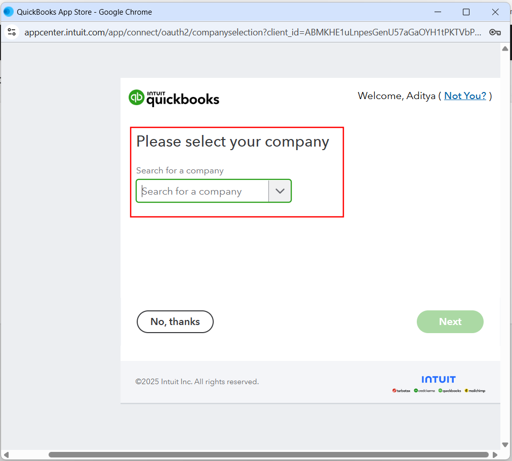 - After you click on "Connect to QuickBooks", you need to enter the QuickBooks credentials and select the company which you want to connect with our app. (If you are already logged in to QuickBooks in another tab of the browser then you only need to select company name to connect with our app.)