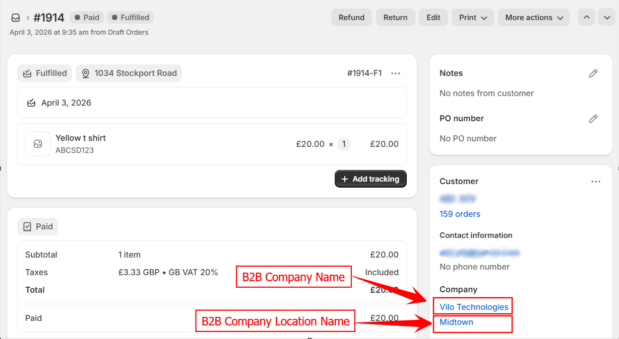 Below is the image where you can find B2B Customer Company Name or B2B Customer Company Location Name in the Shopify Order. Click here for more details on creating and assigning the B2B company and location in Shopify.
