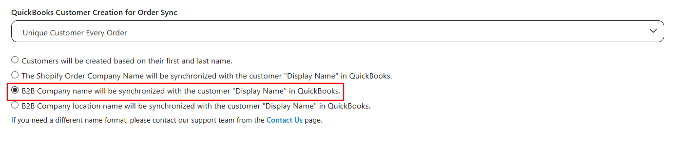 With this option, the B2B company name from the Shopify order is synchronized with the Customer Display Name in QuickBooks.