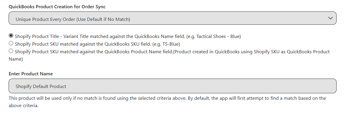 When syncing orders from Shopify to QuickBooks, the app matches each product with an item in QuickBooks. If no match is found, by default it created a new item—helpful for some, but not ideal for stores that want to avoid cluttering QuickBooks with unmatched products.