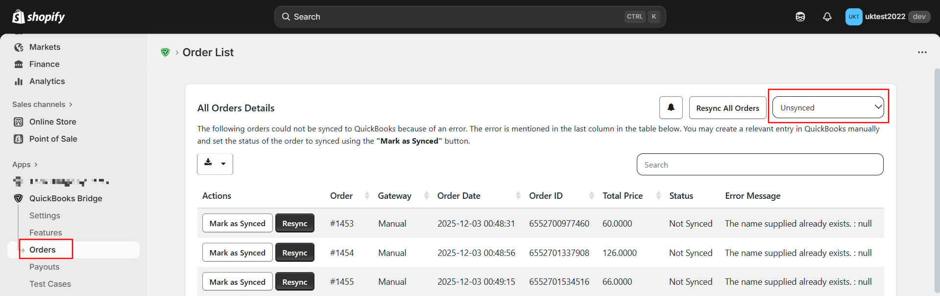 1. Unsynced (Orders Not Synced Due to Errors)