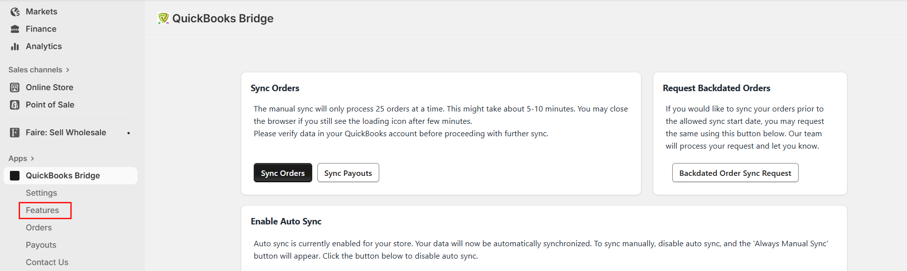 1. Click on the ‘Features’ from the left menu option in the QuickBooks Bridge app.
