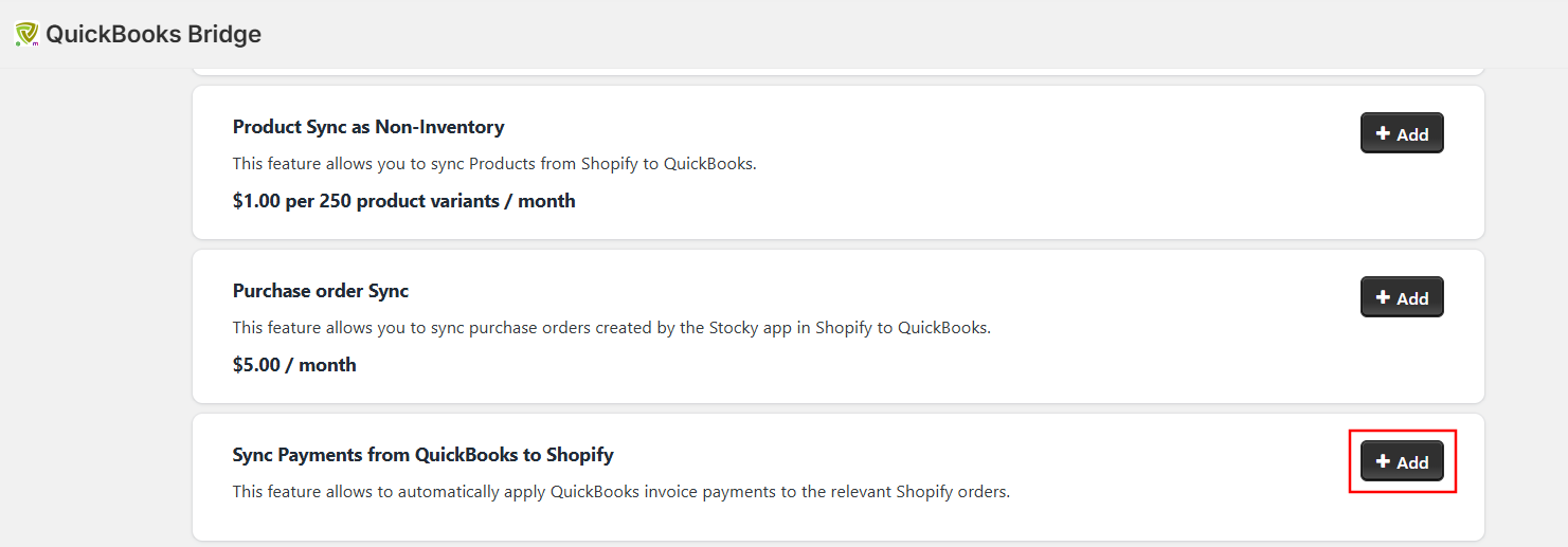 2. Under the Advanced Settings section, locate the feature titled "Sync Payments from QuickBooks to Shopify” and click on ‘+ Add’.
