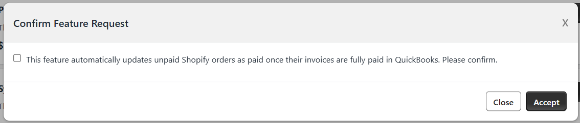 The Payment Sync from QuickBooks to Shopify feature automates the process of updating unpaid Shopify orders to "Paid" when their corresponding invoices are marked as paid in QuickBooks. You can subscribe to this feature from our app’s feature list page. Click on ‘+' icon and give the confirmation to subscribe this feature for your store.
