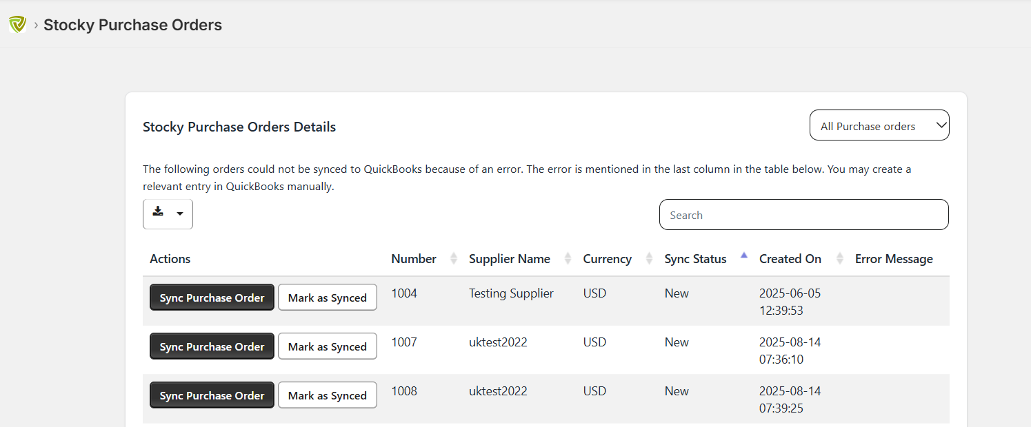 For example, if you have selected the bill option and you want to determine when the bill should be created in QuickBooks, you can opt for the manual sync option. Once you select the manual sync option then you will get the "Stocky Purchase Orders" tab in which you will be able to sync the Stocy purchase orders as a bill by clicking on the option "Sync Purchase orders" button.