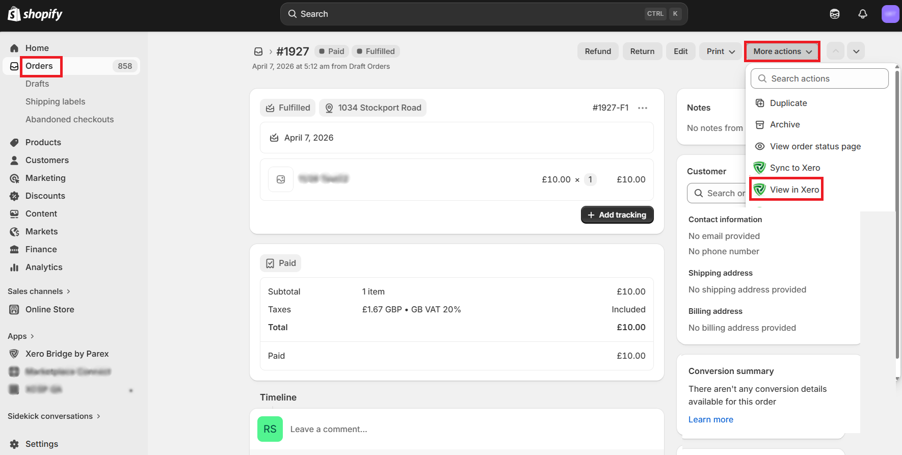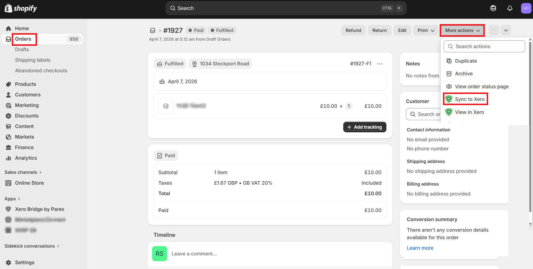 1. Navigate to the 'Orders' section from the left hand menu in Shopify Admin and open the order that you want to sync to Xero.
